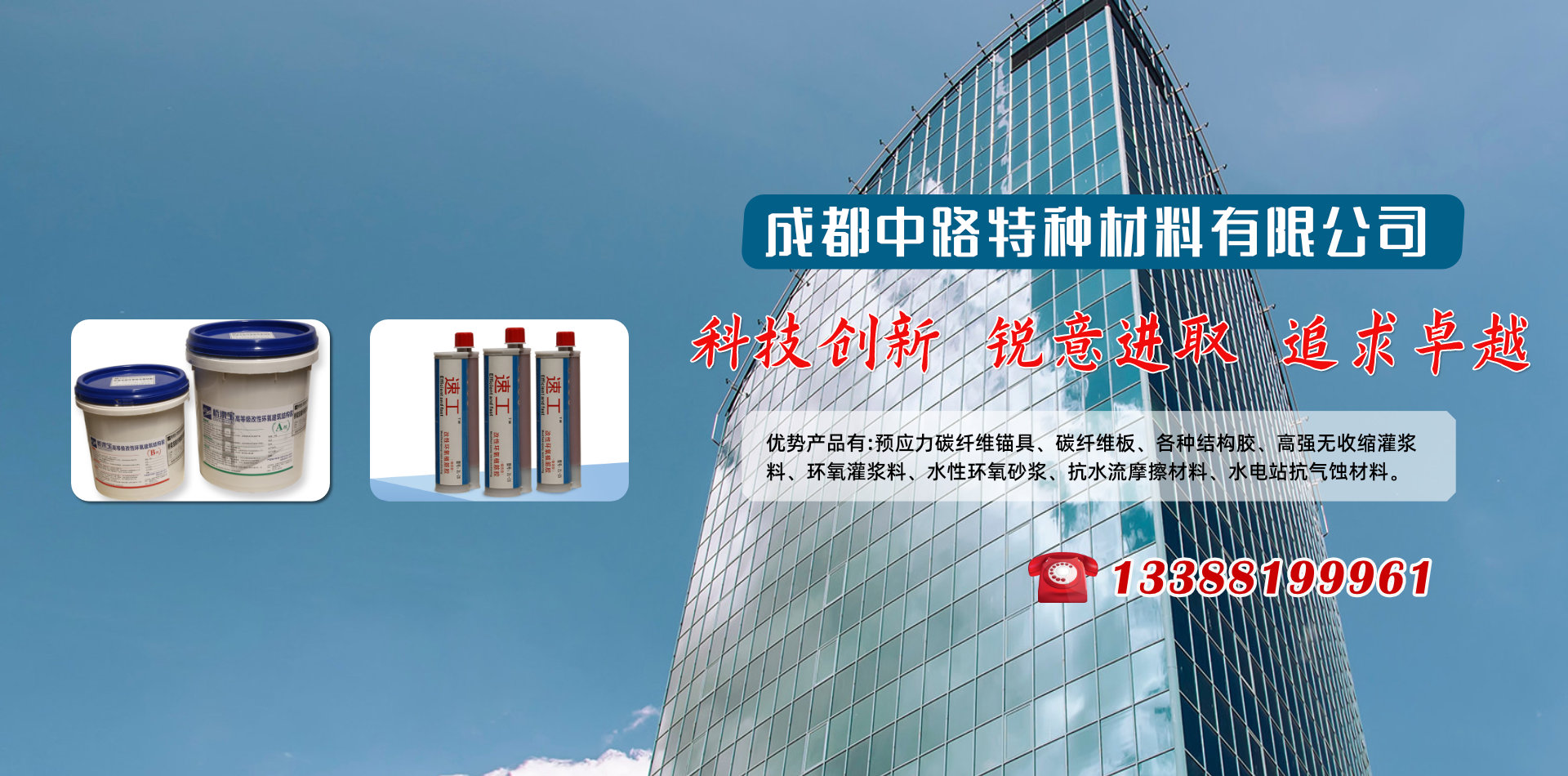 成都中路特種材料有限公司借助清華大學(xué)高分子材料學(xué)科、晨光化工研究院、西南交通大學(xué)、四川交通職業(yè)技術(shù)學(xué)院科研技術(shù)平臺(tái)成為一家集新材料研發(fā)、銷售、技術(shù)服務(wù)和施工于一體的專業(yè)服務(wù)公司,優(yōu)勢產(chǎn)品有:預(yù)應(yīng)力碳纖維錨具、碳纖維板、各種結(jié)構(gòu)膠、高強(qiáng)無收縮灌漿料、環(huán)氧灌漿料、水性環(huán)氧砂漿、抗水流摩擦材料、水電站抗氣蝕材料和研發(fā)各種特殊用途膠黏劑產(chǎn)品地處西南腹地成都,業(yè)務(wù)覆蓋四川各大中小城市、重慶、云南、昆明、新疆、西藏等區(qū)域。產(chǎn)品涵蓋各種加固施工材料、施工設(shè)備及施工配件,品牌有威士邦等aa進(jìn)口品牌,同時(shí)批發(fā)銷售國產(chǎn)高、中、低端品牌,為客戶提供全面參考。 成都中路特種材料有限公司為您提供加固行業(yè)的一站式服務(wù)! 如果您面對(duì)建筑物加固,不知如何下手,我們將針對(duì)您的項(xiàng)目情況,提供全面的技術(shù)指導(dǎo)咨詢,甚至為您量身定做加固方案;如果您面對(duì)項(xiàng)目要求,不知如何購買加固材料,我們將根據(jù)您的需要,提供多種參考,從進(jìn)口品牌、國內(nèi)知名品牌到低端產(chǎn)品,一應(yīng)俱全; 如果你萬事俱備,不知何處尋找施工人員,我們可以為您提供具有多年加固經(jīng)驗(yàn)的專業(yè)隊(duì)伍;中路特種材料致力于為客戶提供全方位的建筑物加固解決方案。 成都中路特種材料有限公司是一座橋,一座連接廠家與用戶的橋,以質(zhì)量求生存,以信譽(yù)圖發(fā)展,成都中路特種材料有限公司期望用真摯的服務(wù)筑起一座客戶信任之橋。   科技創(chuàng)新 銳意進(jìn)取 追求卓越!        熱忱歡迎業(yè)內(nèi)專業(yè)人士加盟合作!